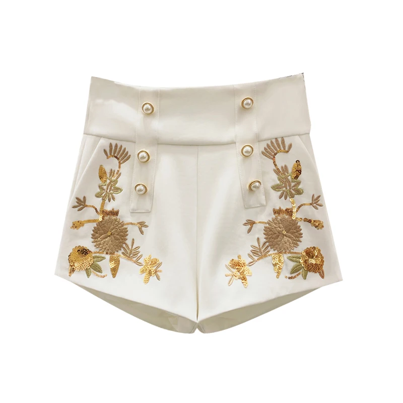 Promo French Style Embroidered Double-breasted Shorts Female Spring Retro Pearl Button High-Waist Temperament Sequined Shorts Nancylim